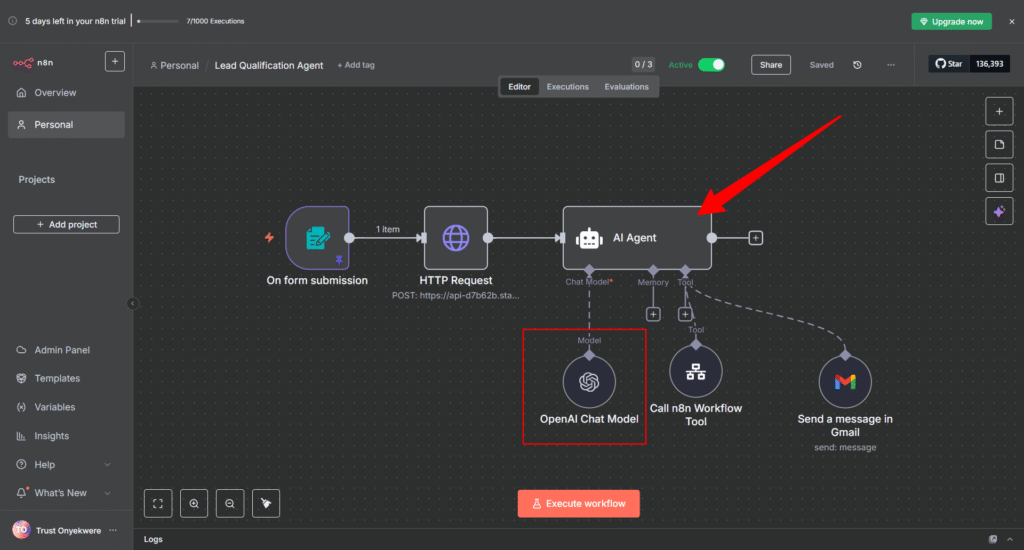 Example: In the second image above, another n8n setup is displayed. Here, a form submission triggers an HTTP request, which then passes into an AI Agent node. The agent is connected to an OpenAI chat model and additional tools. Instead of simply following rules, the agent can analyze the form data, interpret intent, decide which tool to use, and determine whether to respond with an email, call another workflow, or take another action.