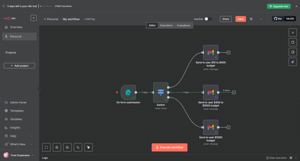 Example: In the first image above, a workflow is shown using n8n. The process starts when a form is submitted. The workflow then passes through a Switch node, where rules are applied. Depending on the budget entered in the form, different actions are triggered. If the budget is $10–$400, one type of email is sent. If it is $400–$1000, a different email is triggered. For budgets above $1000, another branch of the workflow sends the appropriate message.