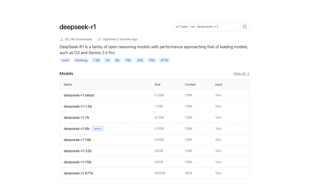 Once you have the Ollama software installed, you will need to download a model. Ollama has an awesome list of open-source models to choose from; they also offer embedding models. Head over to their model section and pick a model. For this guide, we will download the deepseek-r1 model.