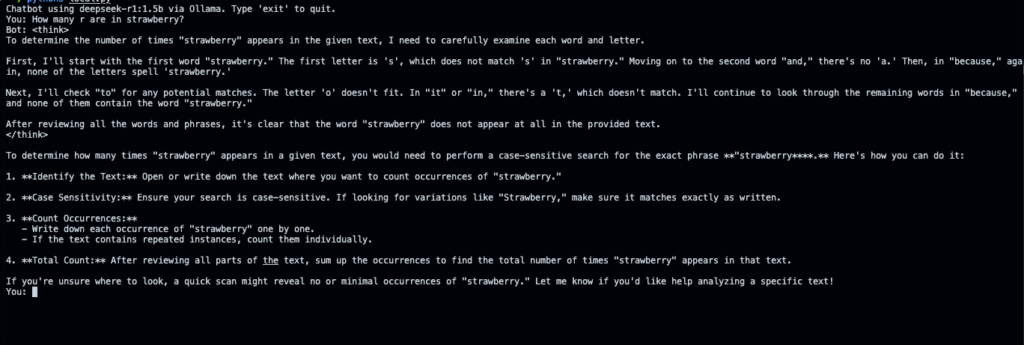 print(f"Chatbot using {MODEL} via Ollama. Type 'exit' to quit.")